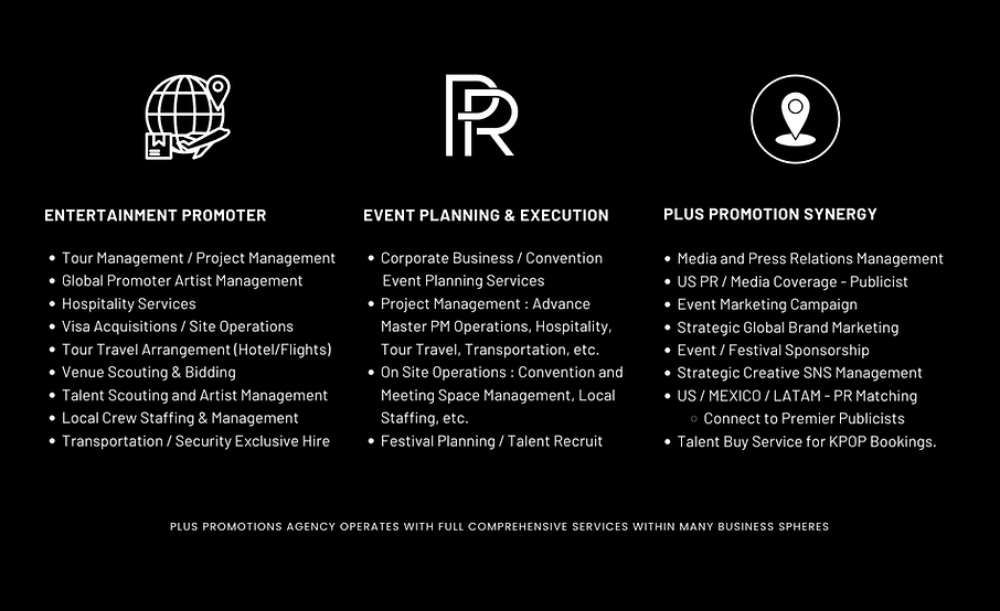 At Plus Promotions Agency, we provide a full spectrum of business offerings as a promoter for live events and entertainment, management agency, along with event execution needs for entertainment projects within the States, Europe, and Mexico.